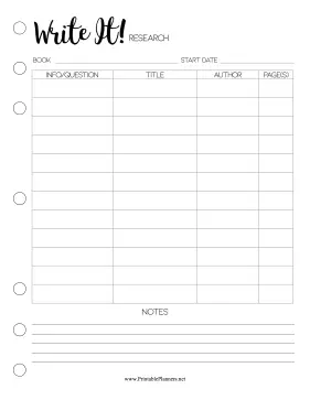 This printable writing research planner keeps track of resources to be cited or acknowledged.